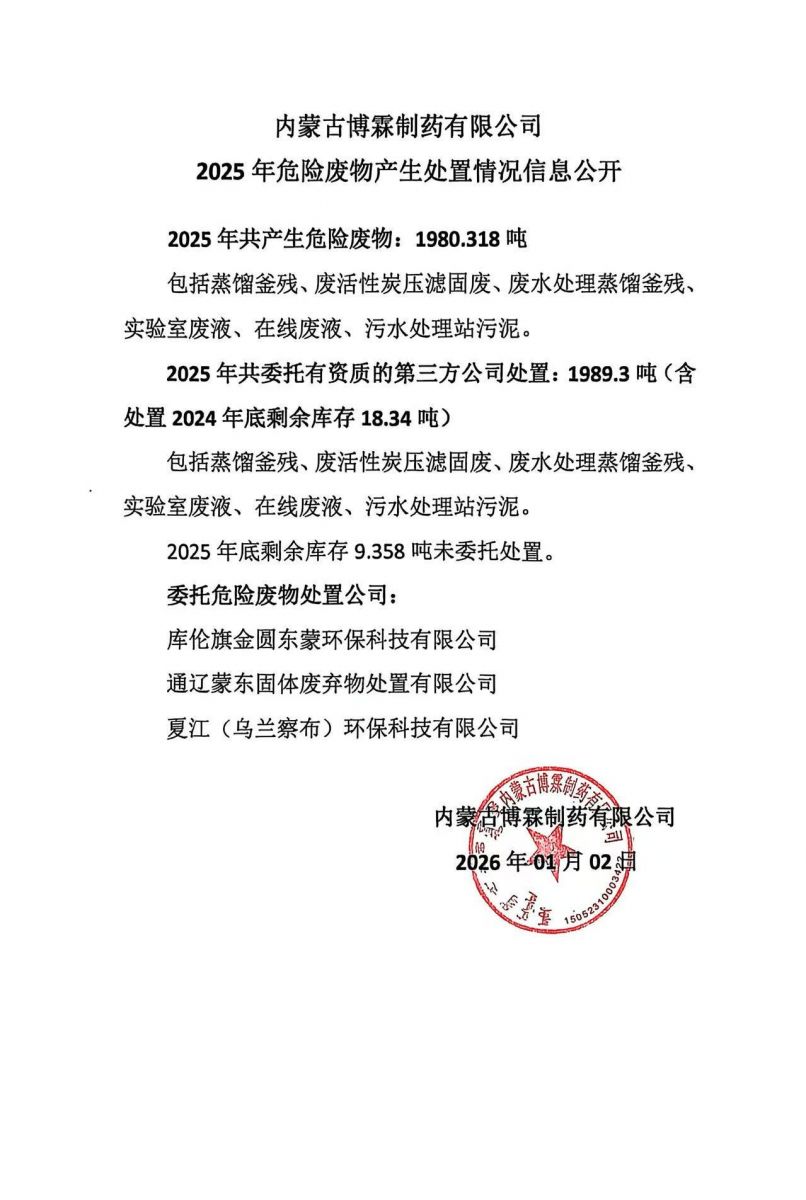 2025年内蒙古博霖危险废物产生处理情况信息公开